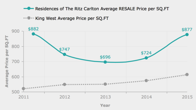 As you can see on the above chart, prices are now averaging close to $900 per square foot at the Rtiz and in 2015 saw a huge increase in prices of 21% over 2014. Four units even sold for over $3-million (an extremely rare number for a condo in 2012) over the past year at the Ritz and over $1000 PSF.