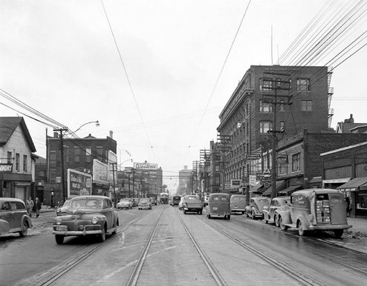 Looking west towards Yonge and Bloor intersection, 1950s