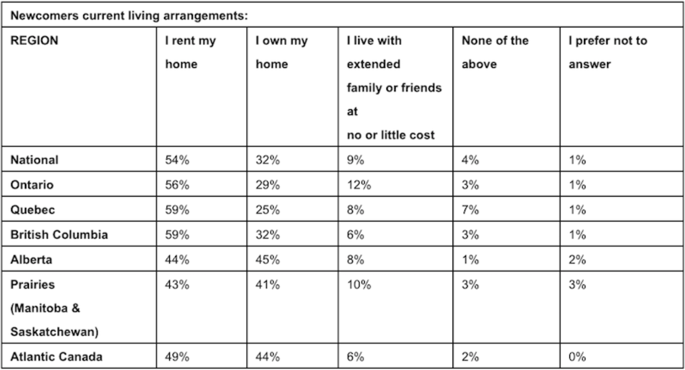 In the province, 60 per cent of newcomers rent their first home, 16 per cent purchase, and 20 per cent live with family or friends at little or no cost when they arrive in Canada.