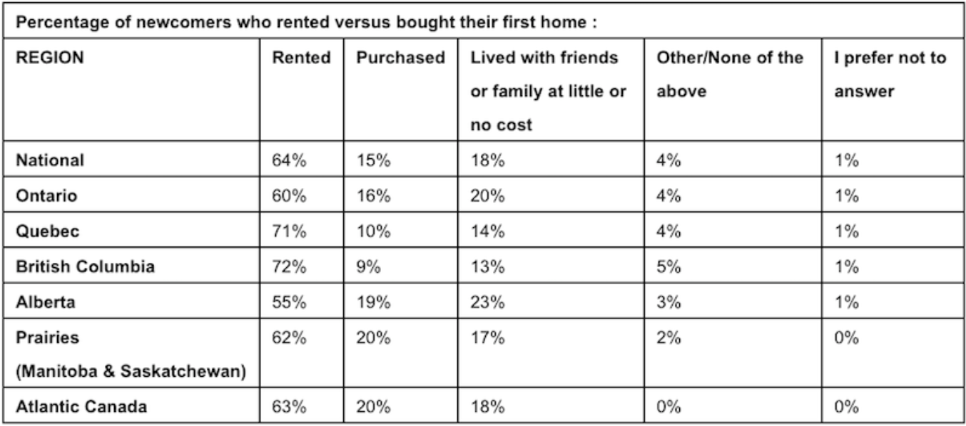The study showed that newcomes wait three years before purchasing a home after arriving in the country. Sixty-four per cent of respondents rent their first home, 15 per cent purchase, and 18 per cent choose to first live with family or friends at little or no cost.