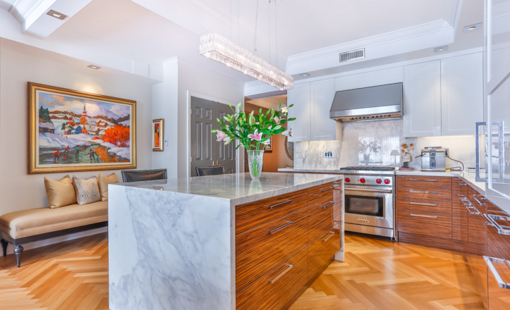 Big Selling Point: The kitchen is spacious and stylish. It has a wide marble island with big drawers underneath, attractive lighted cabinetry and high-quality Wolf appliances.