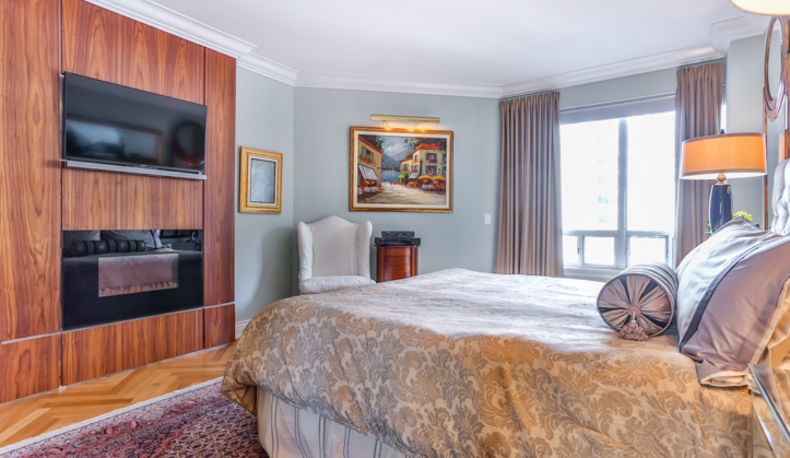 The History: The building was built in 1999, but every room was upgraded shortly before the current owner purchased it last November. The big overhaul included opening up the living-dining space, raising the ceilings to allow chandeliers, laying herringbone hardwood floors, installing walnut wall units with TVs and fireplaces and redoing the entire kitchen.