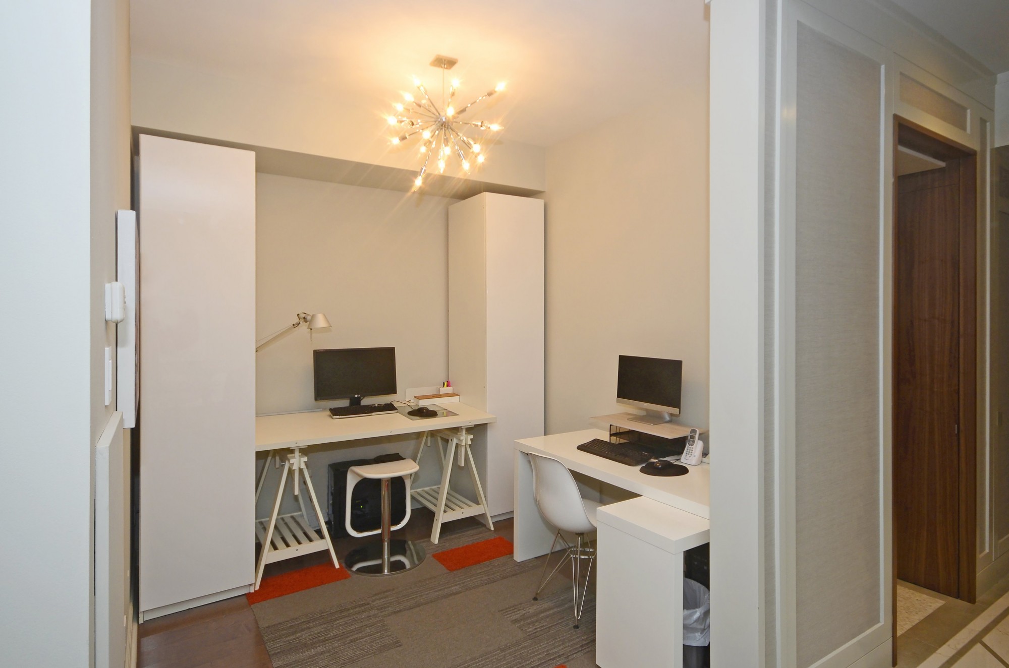 The den isn't huge, but the owners have managed to fit two workspaces in there.