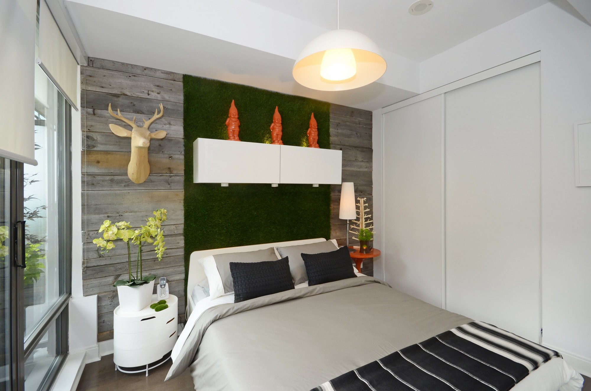 And the bedroom, with a trendy barn board wall.