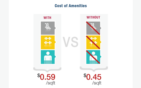 While it's true that most low-fee condos exclude heat, hydro and A/C, the belief that low fees means little or no amenities is not true. Most of the lowest fee-buildings in the city offer a good range of amenities including gyms and concierge.