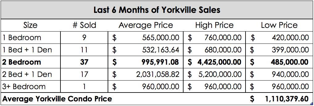 Prices also took a little bit of a dip this month with the average Yorkville condo price falling to approximately $1,110,380, a 3.1% decrease from last period.