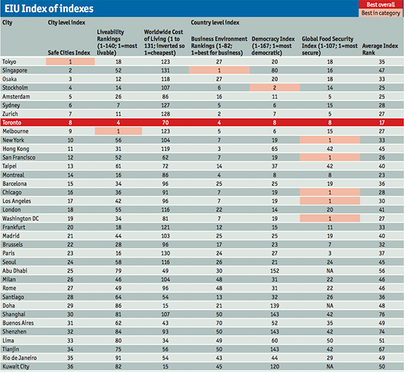 The overall rankings come as part of a new survey from the Economist Intelligence Unit that ranks cities based on how safe they are. According to this report, Toronto is the safest city in North America and eighth-ranked city in the world, trailing Tokyo, Singapore, Osaka, Stockholm, Amsterdam, Sydney and Zurich. The safety index is ranked according to the following criteria: digital security, health security, infrastructure and personal safety.