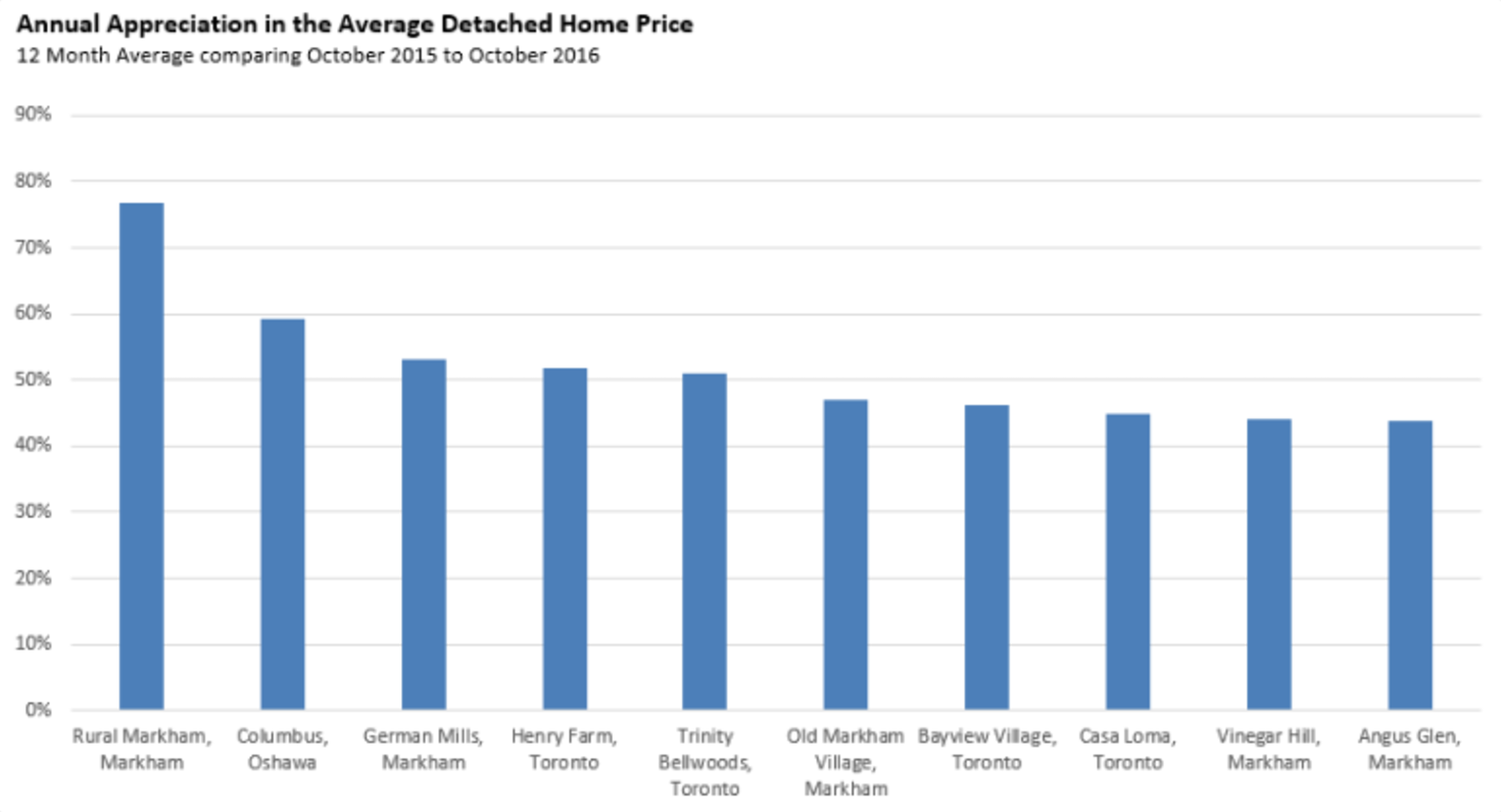 Rural Markham tops the list at 77%, the top 5 neighbourhoods have appreciated more than 50% year over year while the bottom five have appreciated in the 44-47% range. Five out of the top ten neighbourhoods are in Markham, four are in Toronto and one is in Oshawa.