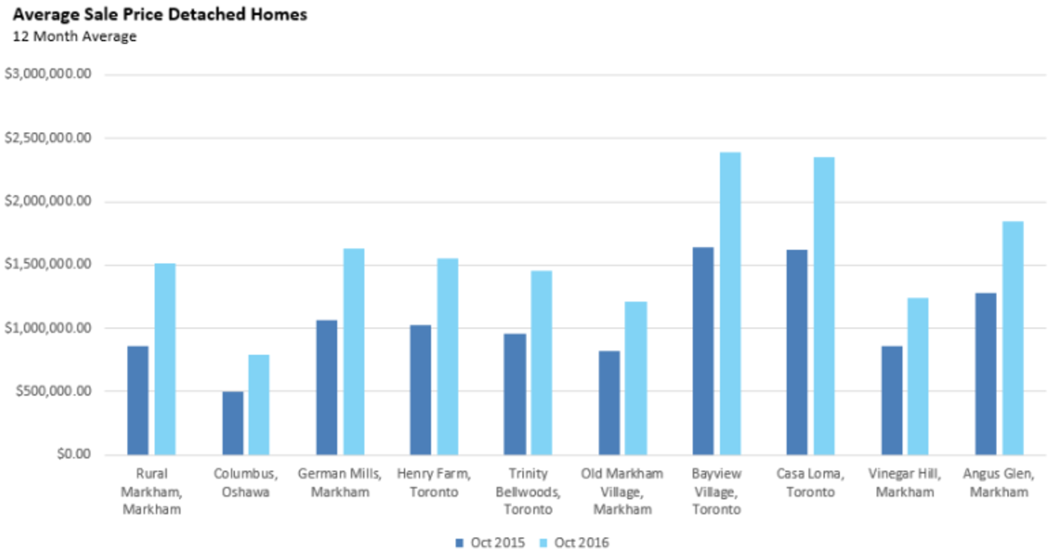 Nine out of the ten neighbourhoods have an average price that is above $1.2M for October 2016.