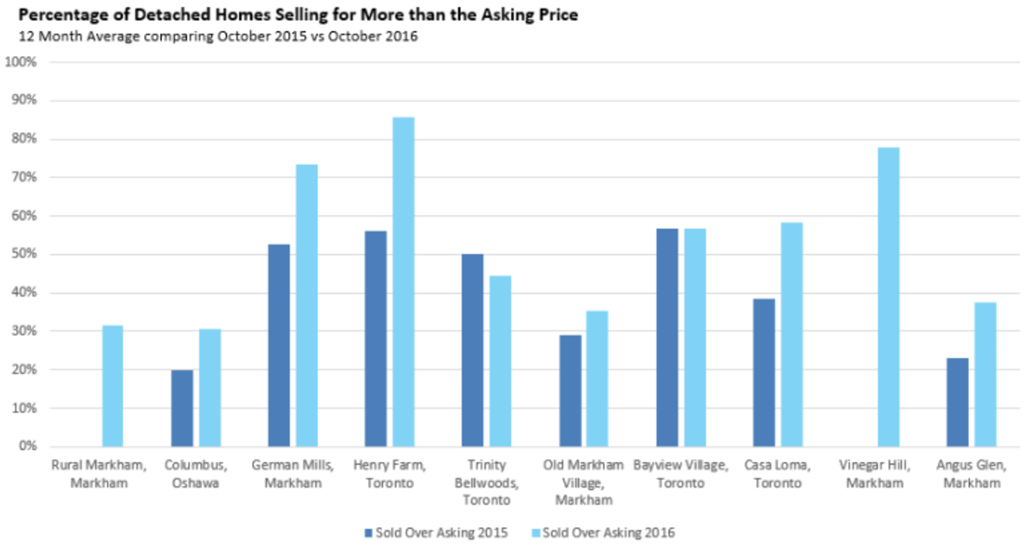 Eight out of the ten neighbourhoods saw a big increase in the percent of homes selling for over asking in 2016.