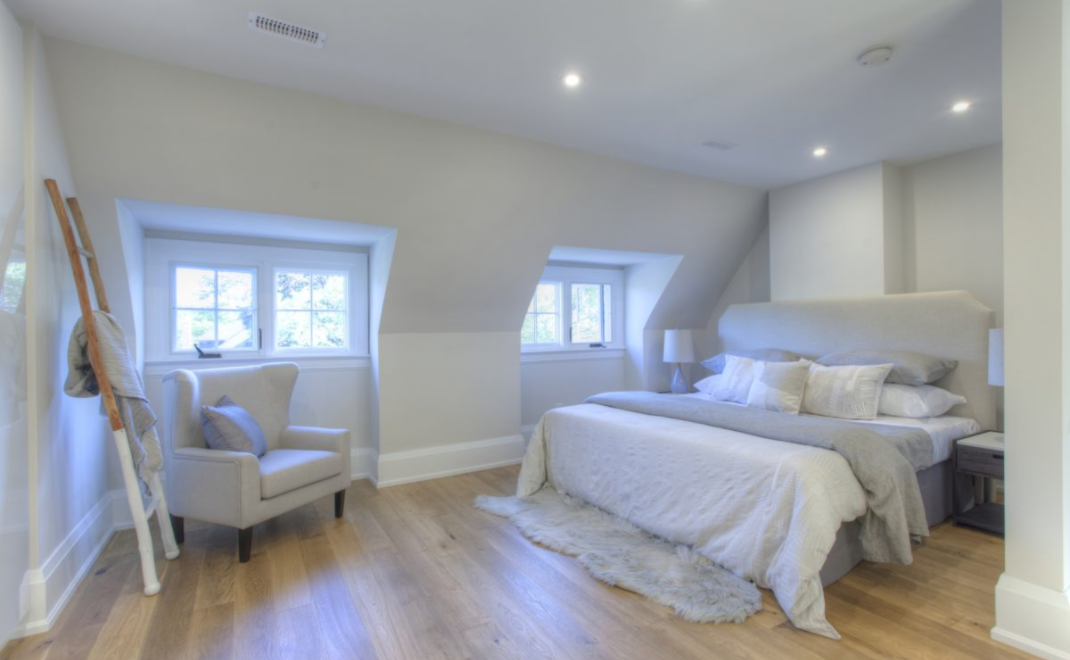 During the recent renovation, the third floor was converted into a master suite. Here's the bedroom area, with dormer windows: