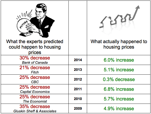 For the last six years, Canadians have been plagued by constant predictions of a housing crash coupled with dire warnings that homes are overvalued by 20% to 35% - and yet, year after year housing prices keep going up, as is shown below.