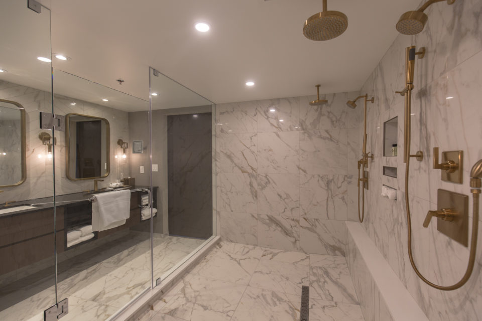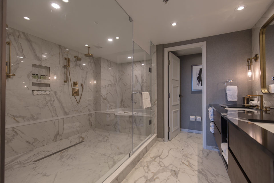 Here's the ensuite, which is larger than most hotel rooms. Forget his-and-hers sinks: this bathroom has his-and-hers rainfall showers. The deep soaker tub is tucked into the shower itself: