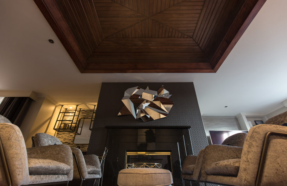 The cherry wood coffered ceiling gives the lounge area a fancy Victorian vibe. The gas fireplace completes the effect: