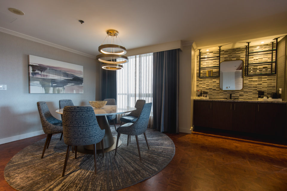 There's a wet bar stocked with Cave Springs wine and Veuve champagne, as well as Nespresso and Numi teas. The six-seat marble dining table is crowned by a custom three-ring chandelier made by Chapman and Co., a Maine-based lighting company: