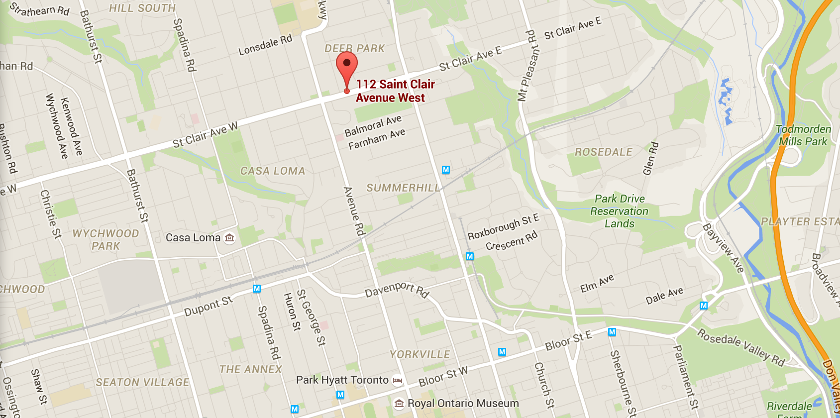 The Location: Located on the north side of St. Clair Avenue West, 112 St. Clair's immediate neighbourhood includes the shops and restaurants of Yonge and St. Clair, the parks and trees of Deer Park and luxury developments such as The Avenue (155 St. Clair Ave. W.). In addition, Bloor Street, Yorkville, the shops of Summerhill and Forest Hill Village are only minutes away. Walk to the St. Clair subway station in under 5 minutes. East and west street car stops are located outside the front door. The building maintains a Walk Score of 92.