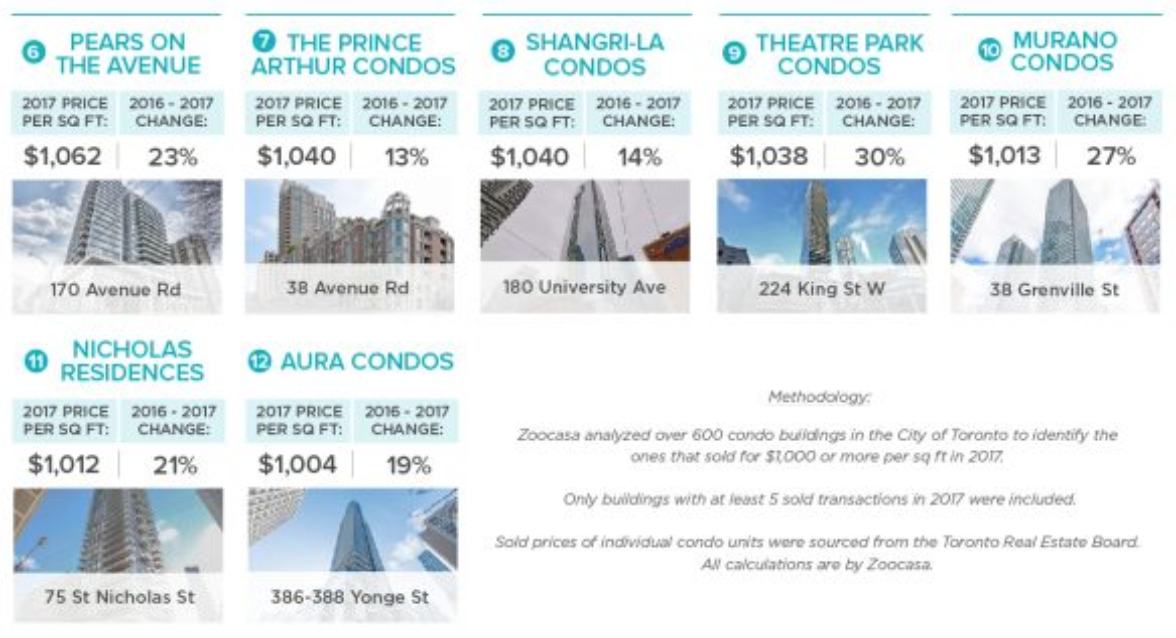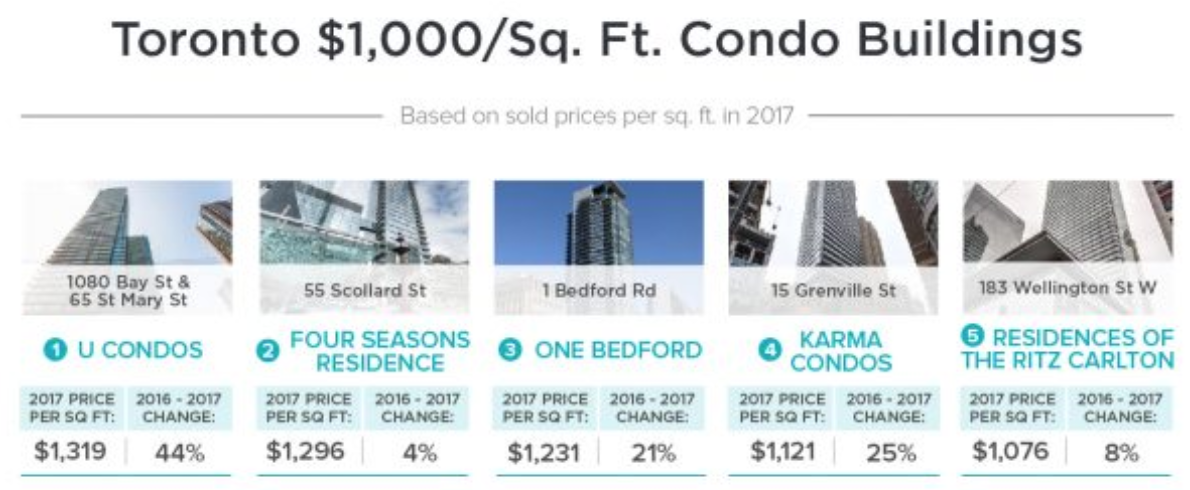 While the average price for an average GTA condo is still below $1,000 per-square-foot, some downtown condos have already crossed that threshold. According to a new report from Zoocasa, 12 buildings are currently selling above that lofty number.