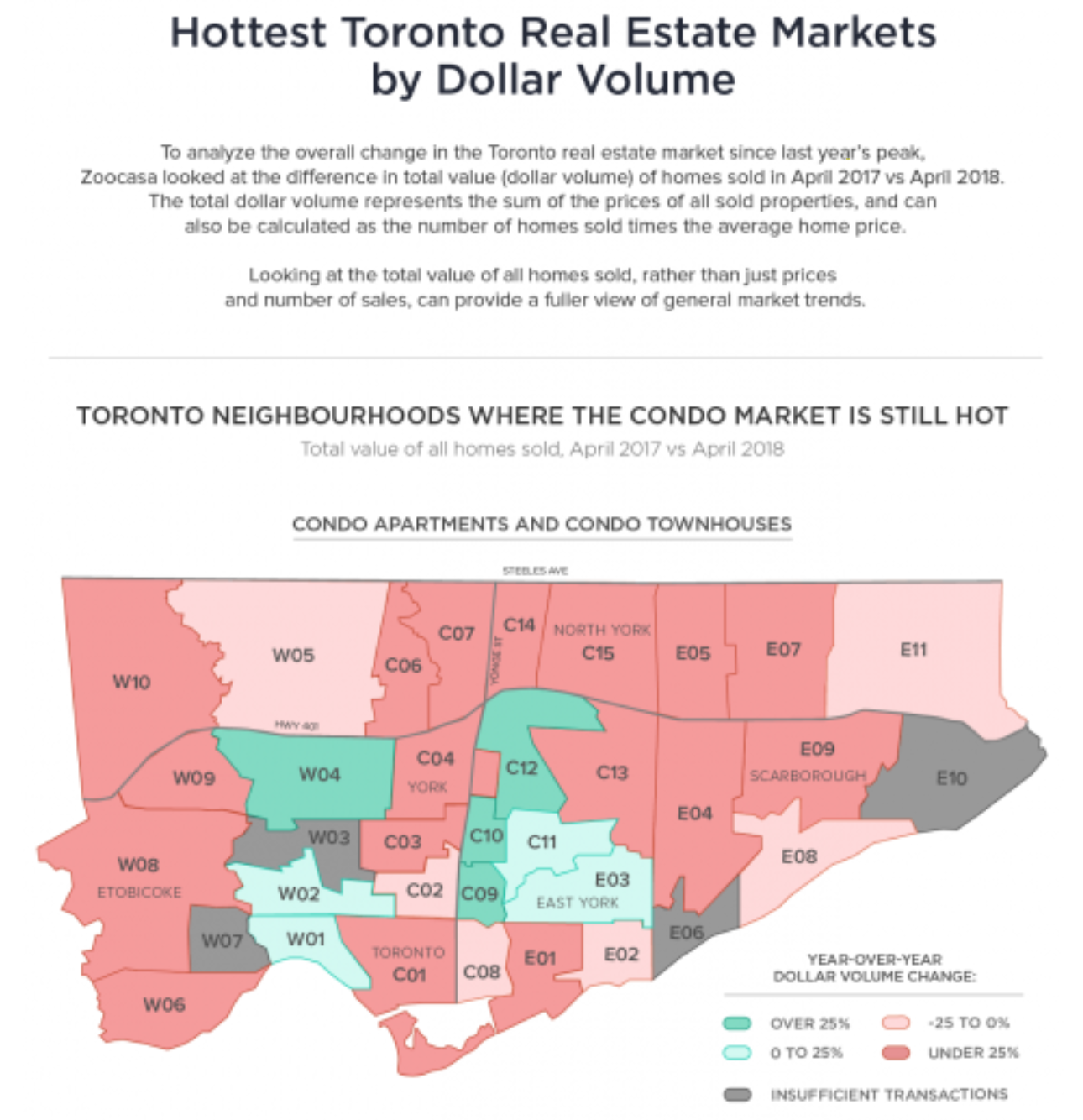 According to Zoocasa, tracking dollar volume can offer important insight into the activity and desirability of a particular neighbourhood.