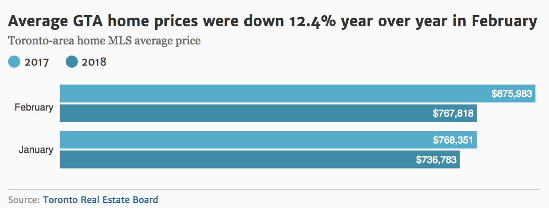 Re-sale home prices in the Toronto region dropped 12.4 percent, or about $110,000, year over year in February. The average price fell to $767,818 from $875,983 for all housing categories, including detached, semi-detached, townhomes and condos.
