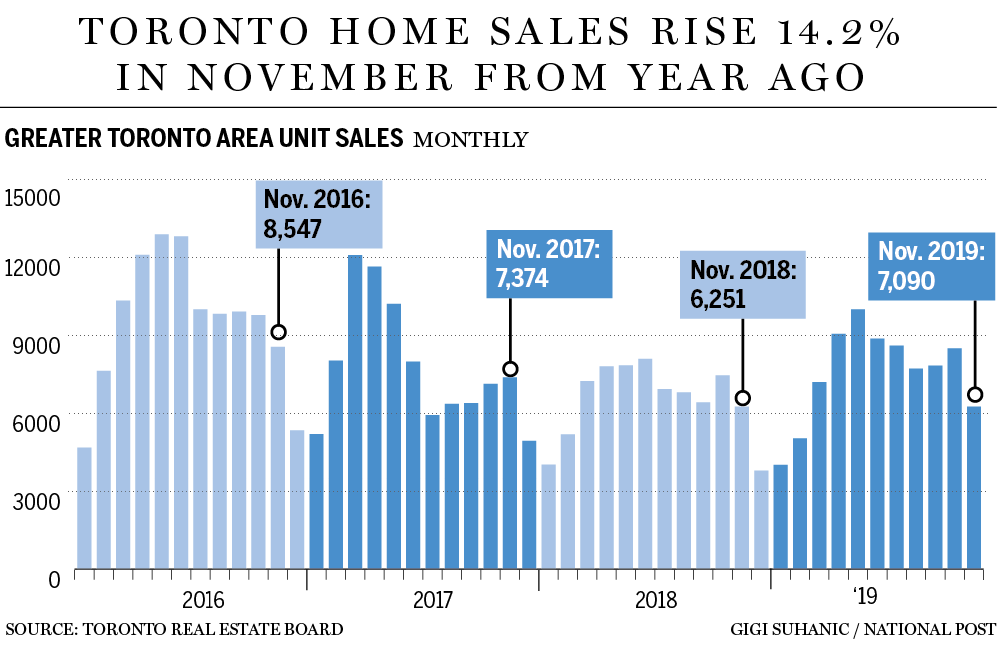 Benchmark prices on homes sold in Canada's biggest city rose 0.6% in November from October, bringing the increase from a year earlier to 6.8%. The number of transactions also rose with sales up 14% from November 2018.