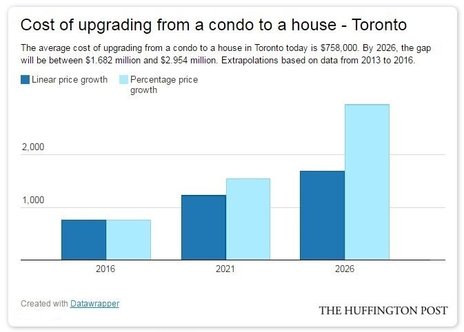 In Toronto today, upgrading from an average condo to an average house costs $758,000. By 2026, it will cost between $1.68-million and $2.95-million. Good luck.