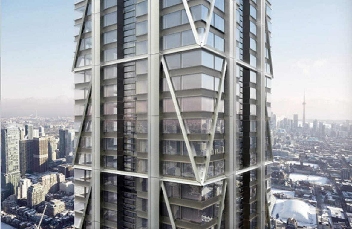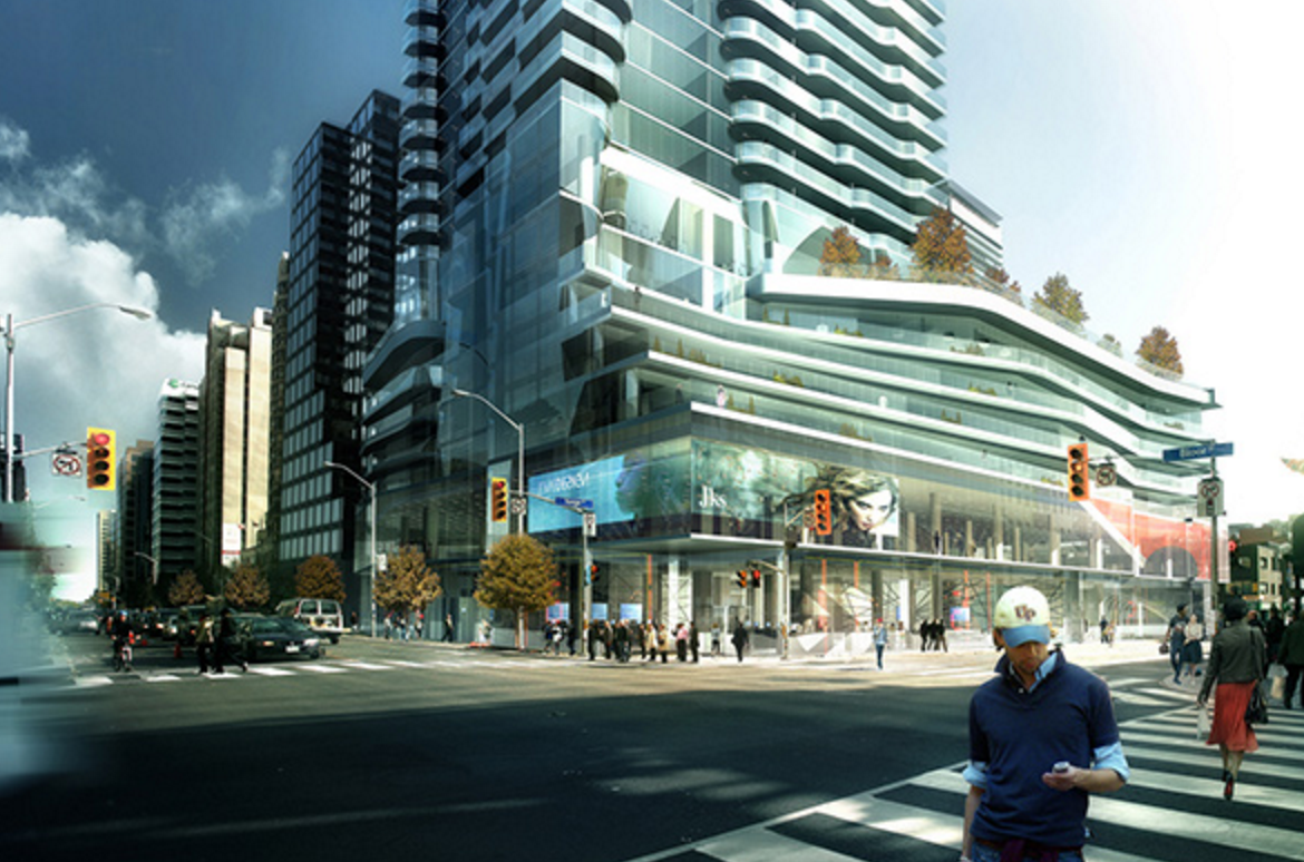 Of similar scale on the other side of Bay Street is 80 Bloor West, a 66-storey condo that would replace the mid-century building that currently houses Roots' flagship location at street level. The height and design of this project is sure to change, but the intention to demolish the existing building is part and parcel of the new development.