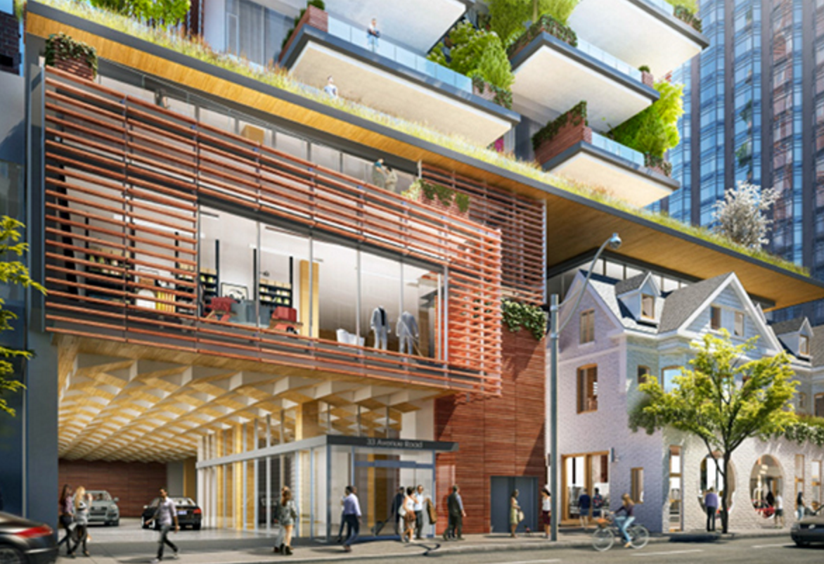Next up is 33 Avenue Road, a 30-storey project from Zeidler Partnership Architects, which will wrap around a number of the historical properties facing Avenue Road at Yorkville Avenue. York Square, as the current site is referred to, was originally in danger, but modified plans would preserve at least some of its unique character.