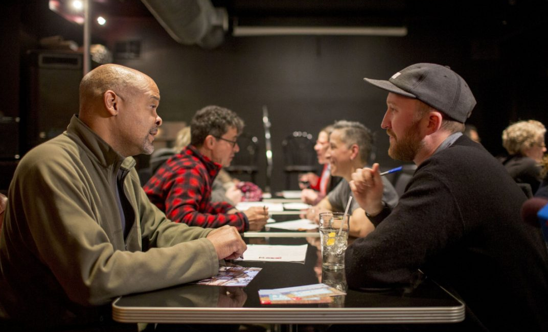 The remaining participants sit at tables in spots numbered either 1 or 2. They have been given a list of conversation starter questions. The idea is to have an introductory chat before the bell signals that it's time to move to the next chair and get to know another person.